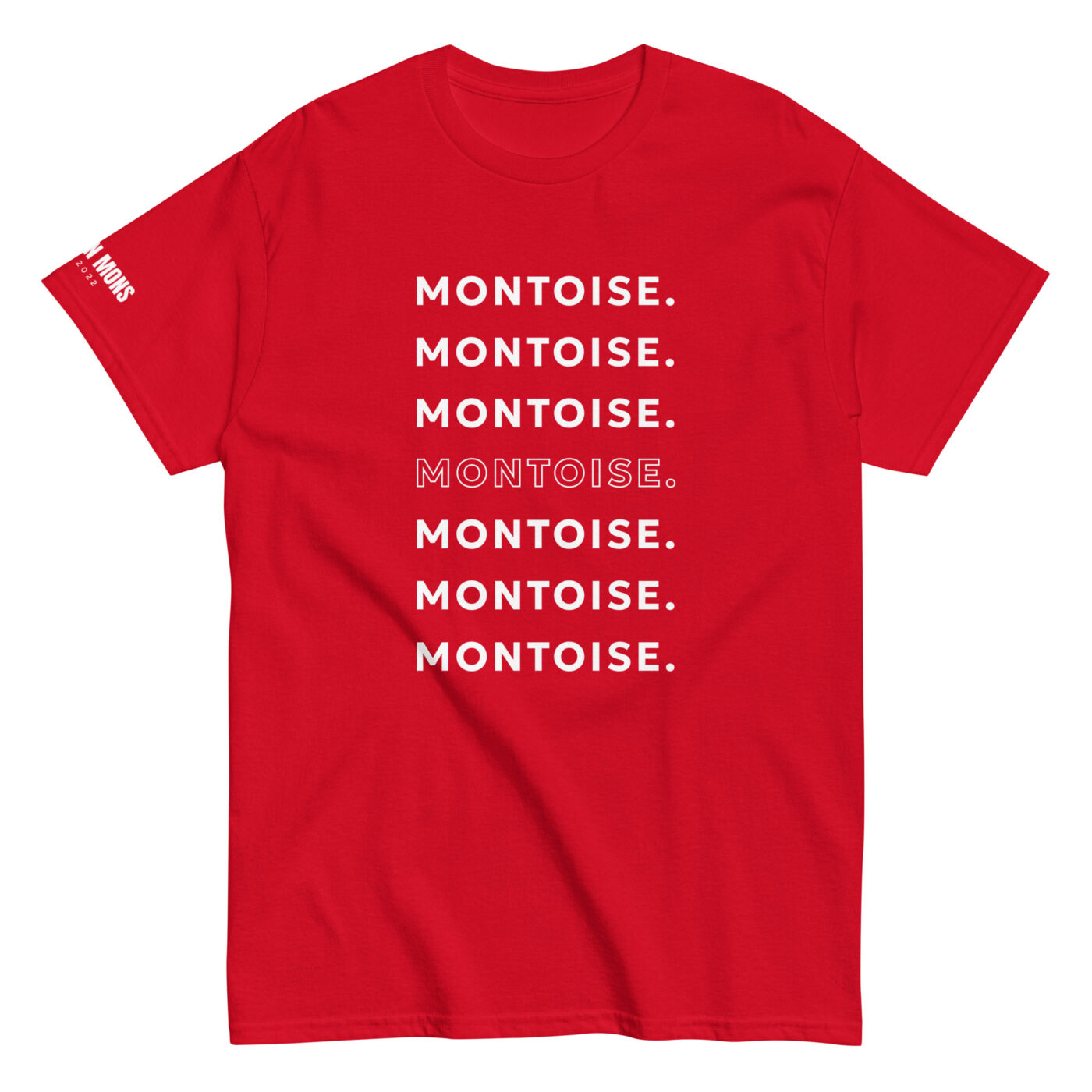 Issu de notre Collection Montoise, ce t-shirt rouge exclusif met à l’honneur toutes les Montoises. Il affiche une répétition graphique de l’impression « Montoise » sur la face avant (sept fois empilées, avec un effet visuel au centre qui fait ressortir le motif) et un rappel du logo Born in Mons sur la manche droite aux accents blancs.