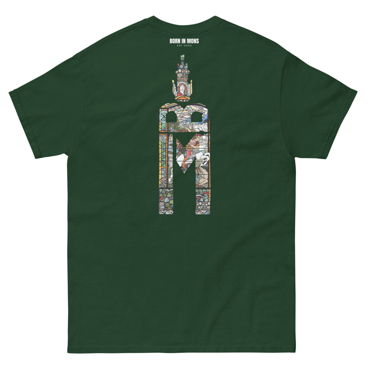 Issu de notre Collection Saint-Georges, ce modèle met à l’honneur l’iconique combat du Lumeçon à Mons. À l’avant, une broderie minimaliste de la lance de Saint-Georges, portée sur le cœur. Dans le dos, une grande impression vitrail représentant Saint-Georges terrassant le dragon, graphisme unique signé @briquettart.